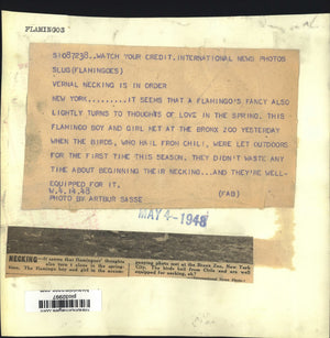 Flamingos. Vernal necking is in order - New York . . . It seems that a flamingo's fancy also lightly turns to thoughts of love in the spring. This flamingo boy and girl met at the Bronx Zoo yesterday when the birds, who hail from Chile, were let outdoors for the first time this season. They didn't waste any time about beginning their necking . . . and they're well equipped for it.