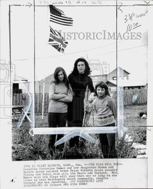 Point Roberts (Whatcom County - Union Jack & Stars & Stripes). Point Roberts, Washington. Canadian Christine Emmas and her daughters Susan and Sandra stand outside their Point Roberts house proudly flying the Union Jack with the Stars and Stripes. Mrs. Emmas says the flags will stay that way as long as she lives in this Washington state community, despite threats she has received.