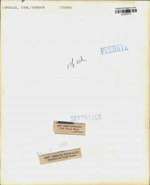 Connally, John, Governor (Texas). Austin, Texas. Texas Governor John Connally, who was wounded in the same flurry of shots that killed President John F. Kennedy, discusses the Warren Commission Report on the assassination. Connally said the report evoked painful memories of the details of that tragic day.