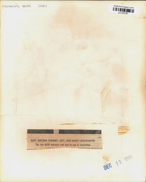 Goldwater, Barry (Grand Old Party). Washington. Michigan Governor George Romney, left, and former Senator Barry Goldwater get together prior to a meeting of the Republican Coordinating Committee today in Washington. Most prominent Republicans attended the meeting.