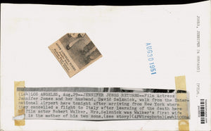 (films) Los Angeles: Jennifer Jones ReturnsE”Film Actress Jennifer Jones and her husband, David Selznick, walk from the International Airport here tonight after arriving from New York where they cancelled a flight to Italy after learning of the death here of film actor Robert Walker. Mrs. Selznick was Walker's first wife and is the mother of his two sons.
