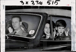 Great Britain - Royal Family. Grinning and waving like any family going a-picnicking, Britain's royal family leaves Buckingham Palace in London for Easter stay at Windsor Castle. Duke of Edinburgh keeps both hands on the wheel as Queen Elizabeth and Prince Charles greet crowd. Princess Anne, hidden behind her father, has a gloved-hand wave for folks on far side of car.