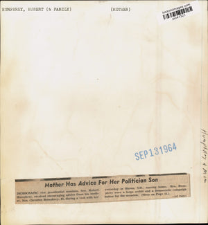 Humphrey, Hubert (& Family) (Mother). Democratic vice presidential nominee, Senator Hubert Humphrey, received encouraging advice from his mother, Mrs. Christine Humphrey, 83, during a visit with her yesterday in Huron, South Dakota, nursing home. Mrs. Humphrey wore a large orchid and a Democratic campaign button for the occasion.