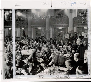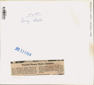 Republican Party - National - 1964. In a crowd of people, cameras and lights, Senator Barry Goldwater speaks before the Republican Party platform committee yesterday in San Francisco, and discusses the various planks he thinks the platform should contain. The Grand Old Party hopeful received a tremendous ovation as he took the speaker's stand and was interrupted by applause som 40 times during his talk.