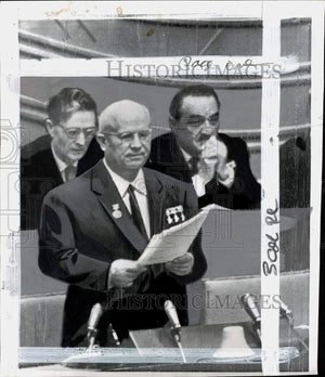 Khrushchev, Nikita (Russia). Soviet Premier Nikita Khrushchev, foreground, makes a speech Tuesday to start the 22nd congress of the Communist Party in Moscow. Background, left, is Mikhail Suslov, member of Soviet Presidium. Right background is Anastas Mikoyan, deputy premier.