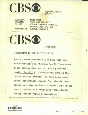 Jack Narz (TV). Popular emcee-announcer Jack Narz will host the festivities on "Now You See It," new fast-paced daytime game series, which premieres Monday, April 1 (11:00-11:30 AM, EDT) on the CBS Television Network. As Narz poses questions, contestants compete for valuable cash prizes by trying to locate answers found within run-on letters on a large game board, in the Monday-through-Friday presentation.