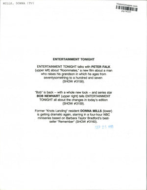 Donna Mills (TV). Entertainment Tonight talks with Peter Falk (upper left) about "Roommates,- a new film about a man who raises his grandson in which he ages from seventysomething to a hundred and seven (Show #3158). "Bob" is back -- with a whole new look -- and series star Bob Newhart (upper right) tells Entertainment Tonight all about the changes in todayE™s edition (Show #3159). Former "Knots Landing" resident Donna Mills (lower) is getting dramatic again, starring in a four-hour NBC miniseries based on Barbara Taylor BradfordE™s bestseller "Remember" (Show #3160).