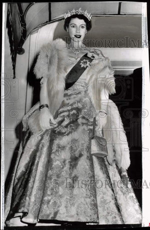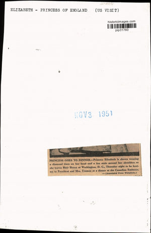 Elizabeth-Princess of England (U.S. visit) - Princess Elizabeth is shown wearing a diamond tiara on her hand and a fox stole around her shoulders as she leaves Blair House at Washington, D.C., Thursday night to be hostess to President and Mrs. Truman at a dinner at the Canadian Embassy.