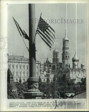 1974 Press Photo American Flag and Buildings at Moscow Russia City View