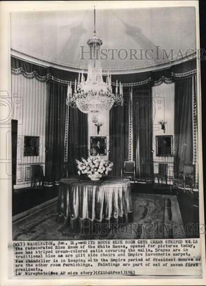 Washington, District of Columbia, Blue Room. The redecorated Blue Room of the White House, opened for pictures today, now has striped cream-colored satin covering the walls. Drapes are in traditional blue as are gilt side chairs and Empire Savonnerie carpet. New chandelier is in keeping with the Empire period of President Monroe as are the other room furnishings. Paintings are part of set of seven first presidents. A chandelier over a table with flowers in the Blue Room, DC