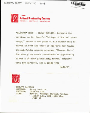 Babbitt, Harry (Bromide) (Television). Harry Babbitt, formerly the baritone on Kay Kyser's "College of Musical Knowledge", enters a new phase of his career when he serves as host and emcee of National Broadcasting Company-Television's new Monday-through-Friday morning program, "Glamour Girl". The show gives women contestants an opportunity to win a 24-hour glamorizing course, complete with new wardrobe, and a prize trip. Harry Babbitt, Glamour Girl, National Broadcasting Company-Television, Mondays through Fridays, 10:30 a.m., EDT (starting July 6).