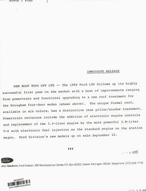 Autos-Ford. The 1984 Ford Limited follows up its highly successful first year on the market with a host of improvements ranging from powertrain and functional upgrading to a new roof treatment for the Brougham four-door sedan (shown above). The unique formal roof, available in six colors, has a distinctive rear pillar/window treatment. Powertrain revisions include the addition of electronic engine controls and replacement of the 3.3-liter engine by the more powerful 3.8-liter V-6 with electronic fuel injection as the standard engine on the station wagon. Ford Division's new models go on sale September 22.
