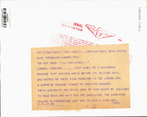 Penguins (General). London, England. That label on a Christmas package that arrives weeks before the release date, was wasted on these King Penguins in the London Zoo. A surprise package tossed to them has aroused their curiosity and while some of them might be inclined to hold back and wait for the unveiling, the long-nose fellow in foreground just has to have a look-see.