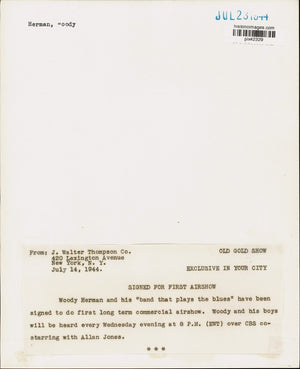 Herman, Woody. Woody Herman and his "band that plays the blues" have been signed to do first long term commercial airshow. Woody and his boys will be heard every Wednesday evening at 8 P.M. (EWT) over Columbia Broadcasting System co-starring with Allan Jones.
