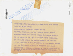 Lourdes, France - Infirm pilgrims in wheelchairs lead procession of pilgrims through the narrow streets to the Shrine of Our Lady of Lourdes where celebration of High Mass outside the Basilica marked the opening of the centenary of the apparitions of the Blessed Virgin Mary to 14-year-old Bernadette Soubirous (now Saint Bernadette) in 1858. An estimated 50,000 persons from all corners of the world attended the opening ceremonies.