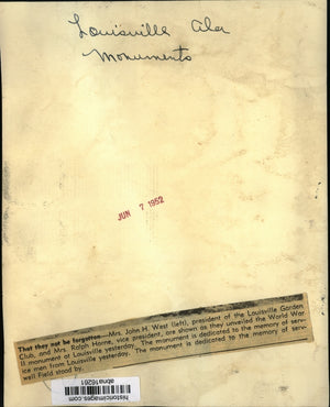 That they not be forgotten--Mrs. John H. West (eft), president of the Louisville Garden Club, and Mrs. Ralph Horne, vice president, are shown as they unveiled the World War II monument at Louisville yesterday. The monument is dedicated to the memory of service men from Louisville yesterday. The monument is dedicated to the memory of servwell. Field stood by. (Louisville, Alabama) (memorials-monuments)