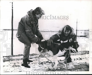 Aerospace Defense Command's Thule Air Base, Greenland, 600 miles north or the Arctic Circle, is home for a small group of Air Force nurses. Taking advantage of one of the "warmer" days, Jaj. Mary Radvansky and Jaj. Reva Sturm prepare Herbie, their three-legged Husky mascot, for a walk. As a small pup, Herbie lost his leg in a dogsled accident. The air base is a strategic Ballistic Missile Early Warning System site. U.S. Air Force Aerospace Defense Command