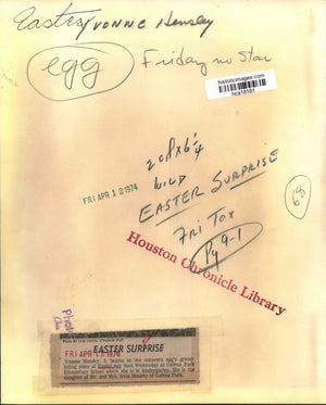 Easter. Yvonne Hensley. Easter Surprise, Yvonne Hensley, 5, beams as she uncovers egg's grassy hiding place at Easter egg hunt Wednesday at Galena Park Elementary School where she is in kindergarten. She is the daughter of Mr. and Mrs. Irvin Hensley of Galena Park.