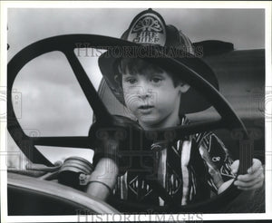 1986 Press Photo Boy in driver's seat of fire truck at Houston Fire Museum
