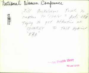 Jill Ruckelshaus points to Montana delegate "Anti-ERA" trying to get attention of speaker to talk against "ERA." National Women's Conference.