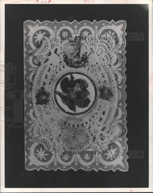 1967 Press Photo Lace Valentine's Card With Cupids and Roses Decorations