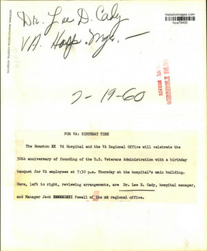 The Houston VA Hospital and the VA Regional Office will celebrate the 30th anniversary of founding of the United States Administration with a birthday banquet for VA employees at 7:30 p.m. Thursday at the hospital's main building. Here, left to right, reviewing arrangements, are Dr. Lee D. Cady, hospital manager, and Manger Jack Powell of the regional office.
