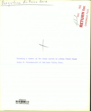 Tracking a bomber on the radar screen is Airman First Class Louis N. Pinsonneault of Red Lake Falls, Minnesota. United States Air Force. 1st. Class. Bergstrom Air Force Base (AFB)