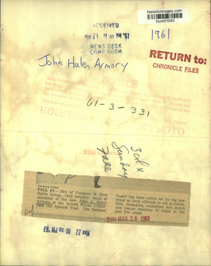 Fall in - Men of Company B, First Battle Group, 143rd Infantry, stand at attention at the new John A. Hulen Armory at the Armed Forces Center, 1800 Old Spanish Trail, Houston, Texas. The National Guard has been called out by the government or local officials to aid in floods, fires, tornadoes, explosions and wearch and rescue missions 47 times in the past five years.