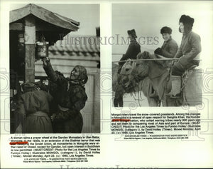 1990 Press Photo Mongolian Woman Spins Prayer Wheel & Horse Riders - hcx11132
