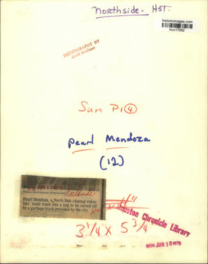 Northside - Houston. Pearl Mendoza, a North Side cleanup volunteer, loads trash into a bag to be carted off by garbage truck provided by the city. Houston