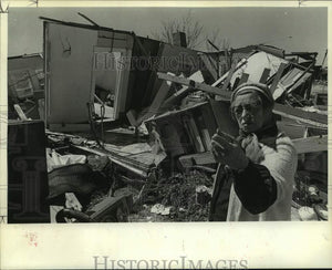1973 Press Photo Loney Hughes by her tornado damaged home in Texas - hcx21412