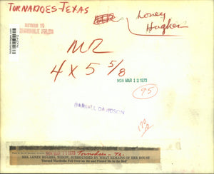 Mrs. Loney Hughes, widow, surrounded by what remains of her house. 'Durned wardrobe fell over on me and pinned me in the bed.' tornadoes - Texas.