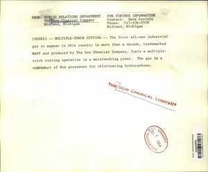 Multiple-Torch Cutting--The first all-new industrial gas to appear in this country in more than a decade, trademarked MAPP and produced by The Dow Chemical Company, fuels a multiple-torch cutting operation in a metalworking plant. The gas is a co-product of Dow processes for chlorinating hydrocarbons.