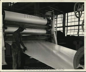 1962 Press Photo Champion Papers Incorporated, Pasadena, worker inspects paper