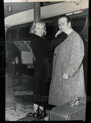 About to hit the trail to Santa Fe and other Southwestern cities, Conductor Walter Susskind gets his collar turned up by Mrs. Susskind just before boarding one of the Houston Symphony Orchestra's touring buses. It was a chilly day in Houston Monday when the orchestras set out on its annual tour and the weather is much colder in the West Texas and New Mexico cities which the ensemble will visit.