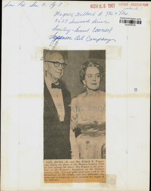 Fall Dance - Mr. and Mrs. Willard B. Wagner, 3627 Inwood Drive, Houston, were among the guests at the Houston Country Club for their annual fall dance. Mrs. Wagner is the president of the Women's Association of the Houston Country Club. Red and gold colors were used in the decorations for the evening and each debutante was presented on a stairway which extended the length of the ballroom. Mr. Wagner is Secretary-General Counsel, Superior Oil Company