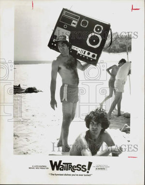 1982 Press Photo Men with Boombox on Beach in "Waitress!" Movie Scene
