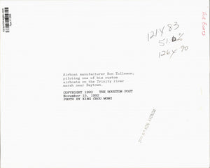 1992 Press Photo Ron Tolleson drives Air Boat, Trinity River Marsh near Baytown