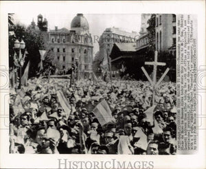Thousands jam into the Plaza de Mayo in Buenos Aires today where they listen to Major General Eduardo Lonardi address them after taking the oath of office as Argentina's new provisional president. At right some of the crowd hold an improvised cross with a V sign, signifying Christ "Vencedor", or conqueror. Argentina.