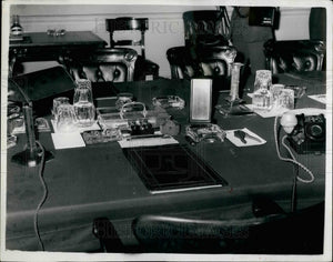The Conference Table In Cabinet Room - Admiralty House: This Prime Minister Harold McMillan's place at the Conference Table in the cabinet Room at Admiralty House, London. Which is serving as his headquarters for the next two years while building experts reconstruct No. 10. Downing Street.Seen at right on table beside the telephone are the pliers used by the Premier to place the official seal on documents, Picture was made at a press view today.