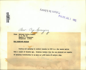 Dusting and spraying to control insects in 1952 is a far easier matter than a couple of decades ago. Airplane duster like the one pictured are capable of applying insecticides to as many as 1,000 acres of cotton a day.
