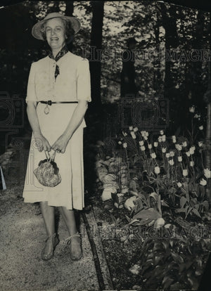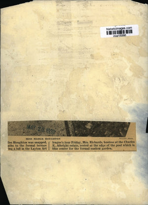 Miss Houghton was snapped, xxx paths to the formal terrace xxx a lull in the Layton Art league's tour Friday, Mrs. Richards, hostess at the Charles E. Albright estate, rested at the edge of the pool which is blue center for the formal sunken garden