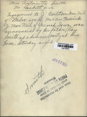 Miss Antoinette Smith of No Hackett is engaged to J. Carlton MacNeil of Milwaukee, son of Mr. & Mrs. Frederick J. MacNeil of Decorah, Iowa was announced by he father, Ray Smith at a dinner party at his home. Saturday night.