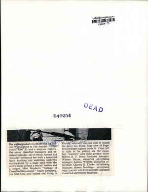 The well attended retirement tea for Dustine Weyher held in The Journal "Green Room" December 23 had a surprise feature. The seven classified managers and assistant manager, all of whom Justine had "trained" presented her with a beautiful black handbag and matching umbrella accompanied by a huge card with the men's heads around a seated Justine and a slogan, Miss Weyher's "College of Classified Knowledge." Harry Gwaltney, her first boss now retired and living in Flordia, naturally was not able to attend the party but Frank Page now of Page-Schwessinger agency made it. From the left to right in the picture are the classified "starters" with their present titles: Robert K. F. Drew, business manager; Warren Heyse, classified advertising manager; Charles K. Clarke, advertising manager; Homer Bendinger, advertising copy control, and Fred Gabriel, assistant classified advertising manager.