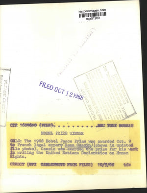 The 1968 Nobel Peace Prize was awarded Oct. 9 to French legal expert Rene Cassin (shown in undated file photo). Cassin was awarded the prize for his work in writing the United Nations Declaration on Human Rights.
