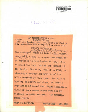 The statue of Ponce de Leon in St. Augustine, Fla., stands on a spot near which he is supposed to have landed in 1513, when he named the land Florida and claimed it for Spain. The city, founded in 1565, is planning elaborate celebration of its 400th anniversary this year. But with a history of strife and storm, it fears a repetition of non-violent African American demonstrations of last summer which were met by violence by white racists. Florida - Parks & Memorials