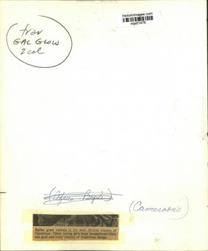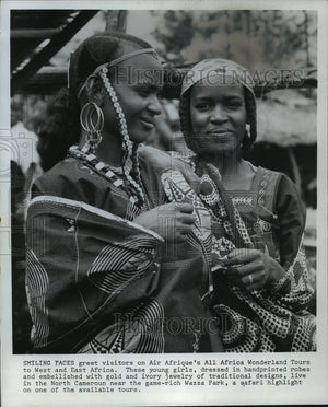 Smiling faces greet visitors on Air Afrique's All Africa Wonderland Tours to West and East Africa. These young girls, dressed in handprinted robes and embellished with gold and ivory jewelry of traditional designs, live in the North Cameroun near the game-rich Wazza Park, a safari highlight on one of the available tours. Cameroons