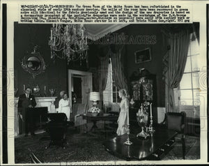 The Green Room of the White House has refurbished in the classical style of early 19th century America. The walls of the room have been recovered in green moire silk identical to the fabric previously used and the design of the new draperies is based on a documentary precedent of the period. The draperies were made in the workshop of the E.W. Browne Decorating Co., Atlanta, GA., Mrs. Nixon, center, displays an unusually rare early 19th century work or writing table, Clement Conger, White House curator is a left, and Tricia Nixon Cox, right