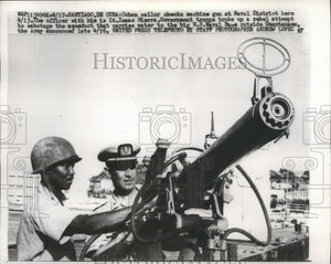 1958 Press Photo Lt. Isaac Sierra and Cuban sailor check gun at Naval District