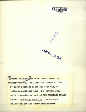 Howard Da Silva stars as "Boss" Tweed in "Stop, Thief!," an historical drama written by Terry Southern about New York City's infamous political boss of a century ago, to be presented as a part of The American parade series, Thursday, April 22 (10:00-11:00 pm, ET) on the CBS Television Network